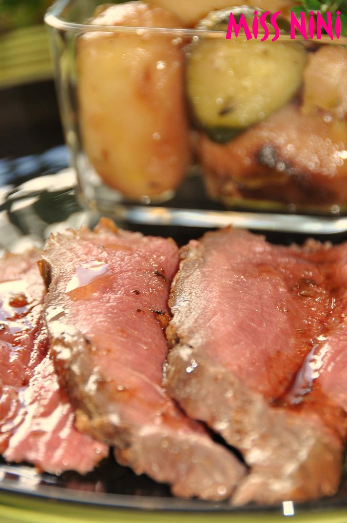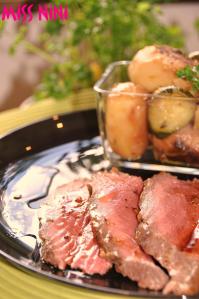 Au niveau cuisson, une règle simple pour avoir un rôti saignant: 15 mn par tranche de 500g dans un four très chaud (250°) soit pour un rosbeef de 1kg: 30 mn de cuisson. Ici, je l’ai accompagné d’une poêlée de petites pommes de terre et de courgettes.