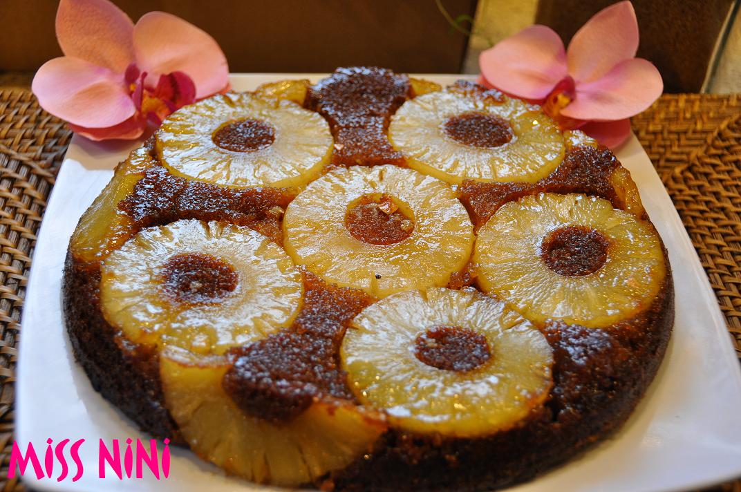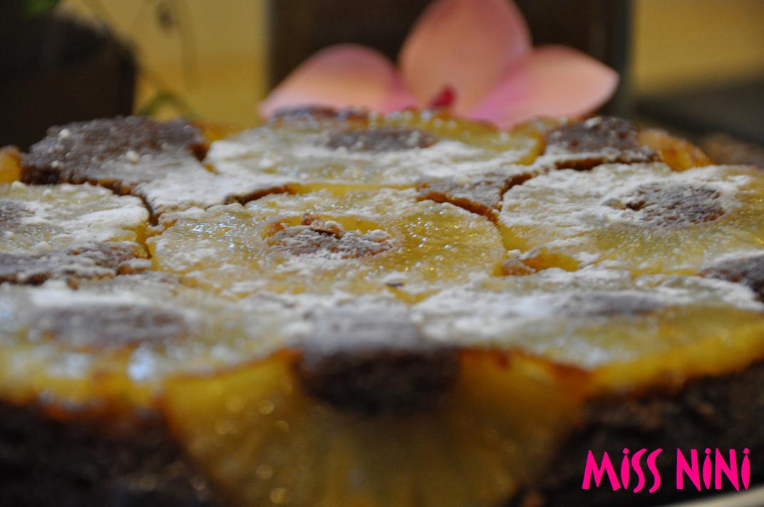 8. A la sortie du four verser doucement sur le gâteau le sirop d’ananas mélangé à la cuillère de rhum.