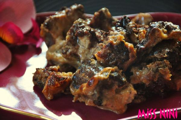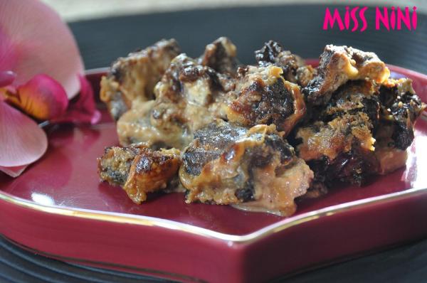 Moi j’ai recyclé une partie de mes cannelés: je les ai coupé en deux pour les poser au fond de mon plat, j’ai recouvert avec des bananes en tranches, j’ai versé dessus mon caramel crémeux, puis une nouvelle couche de cannelés coupés en deux et enfin une poignée de pépites de chocolat. J’ai arrosé le tout d’un mélange lait-crème et oeufs puis au four.