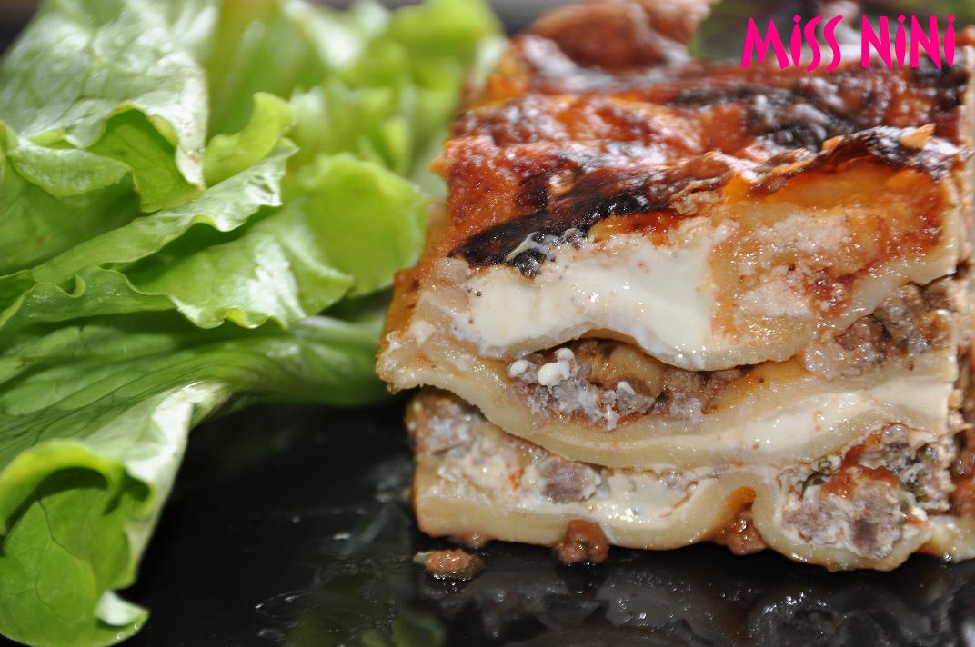 On obtient au final des étages de viande hachée parfumée et de pâtes à lasagnes recouverts d’une béchamel, le tout cuit dans une sauce tomate et gratiné par du fromage. A déguster avec une salade verte.