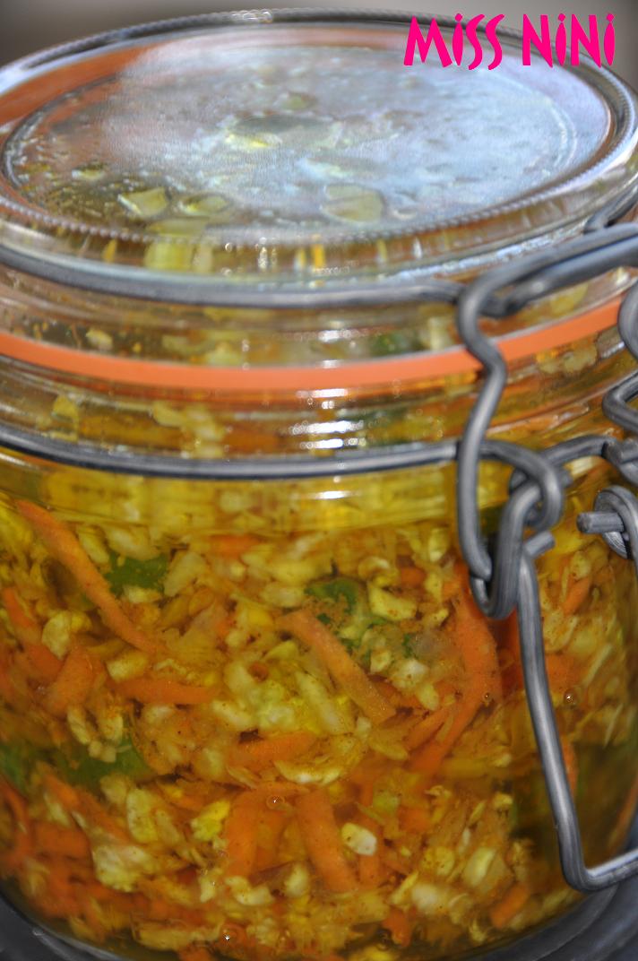 Au final on obtiendra donc des pots de petits légumes encore croquants marinés dans de l’huile parfumée au curry et aux piments.