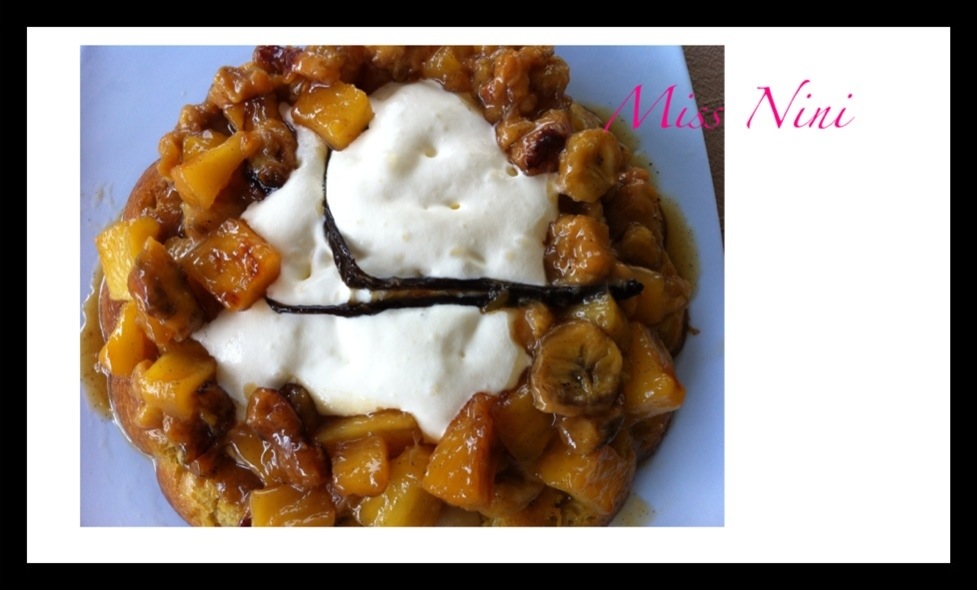 C’est le baba au rhum. Ici je l’ai servi avec des fruits caramélisés à la vanille et une délicieuse crème chantilly.