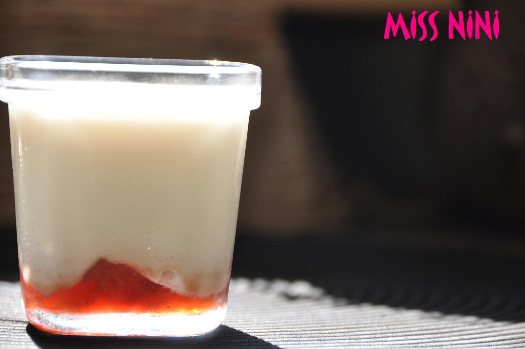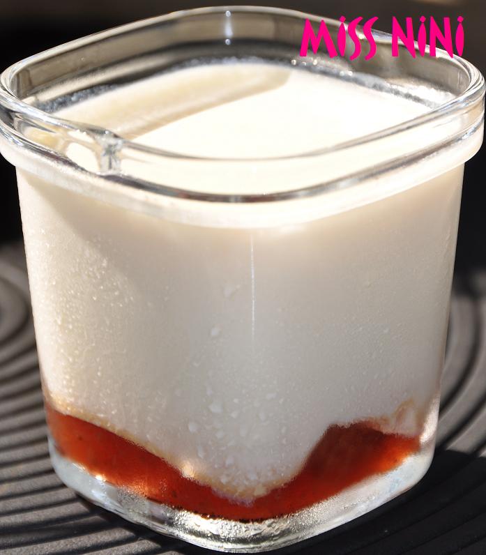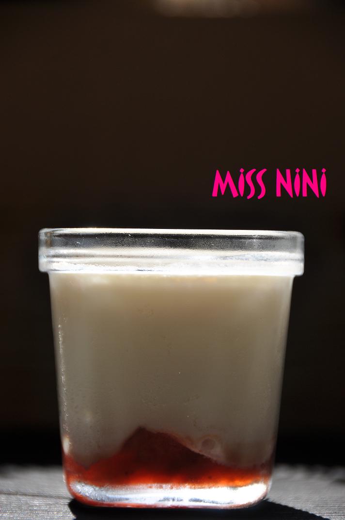 - Verser le mélange pour yaourt dans chaque pot, tout doucement pour ne pas que la confiture et le lait se mélange.