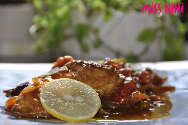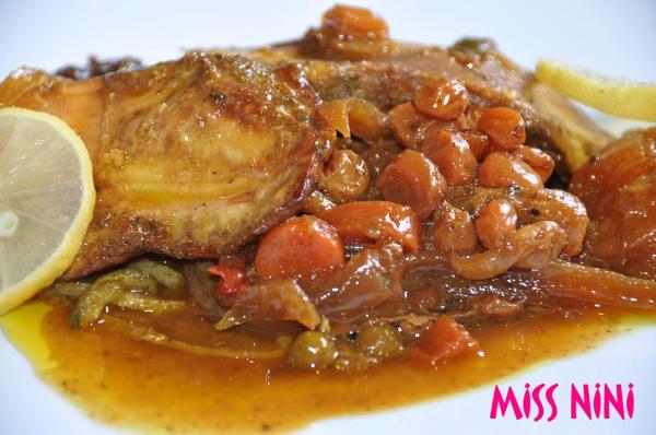 - Mettre dans le plat un peu d’huile d’olive. Faire un lit avec les fruits secs et les échalotes. Verser dessus le poulet et sa marinade. Ajouter les légumes. 2 citrons (frais ou confits) coupés en tranches épaisses. Ajouter un grand verre d’eau. Saler, poivrer. Saupoudrer encore un peu d’épices sur le tout.